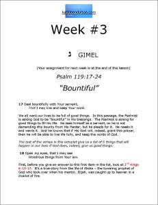 Click on Week#3 to the left and read it through. See how my comments and thoughts line up with what you’ve gotten out of this third set of 8 verses in Psalm 119 as you studied it this last week. Make comments or post questions if you want. I’ll answer them if I can.